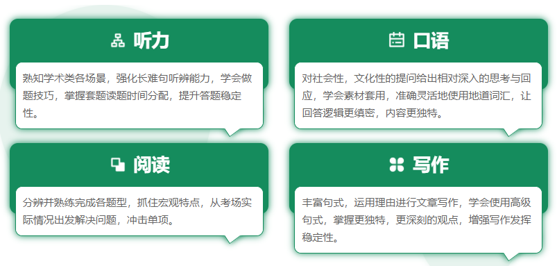 雅思考试考前准备很重要。雅思考试即将到来,总觉得自己之前复习的听力、写作、阅读、口语一塌糊涂,没有了计划和预期的进度。新申途雅思考前班,在夯实英语基本能力的基础上,从听,说,读,写四项入手,通过理解、归纳、整理雅思考试的各种题型。